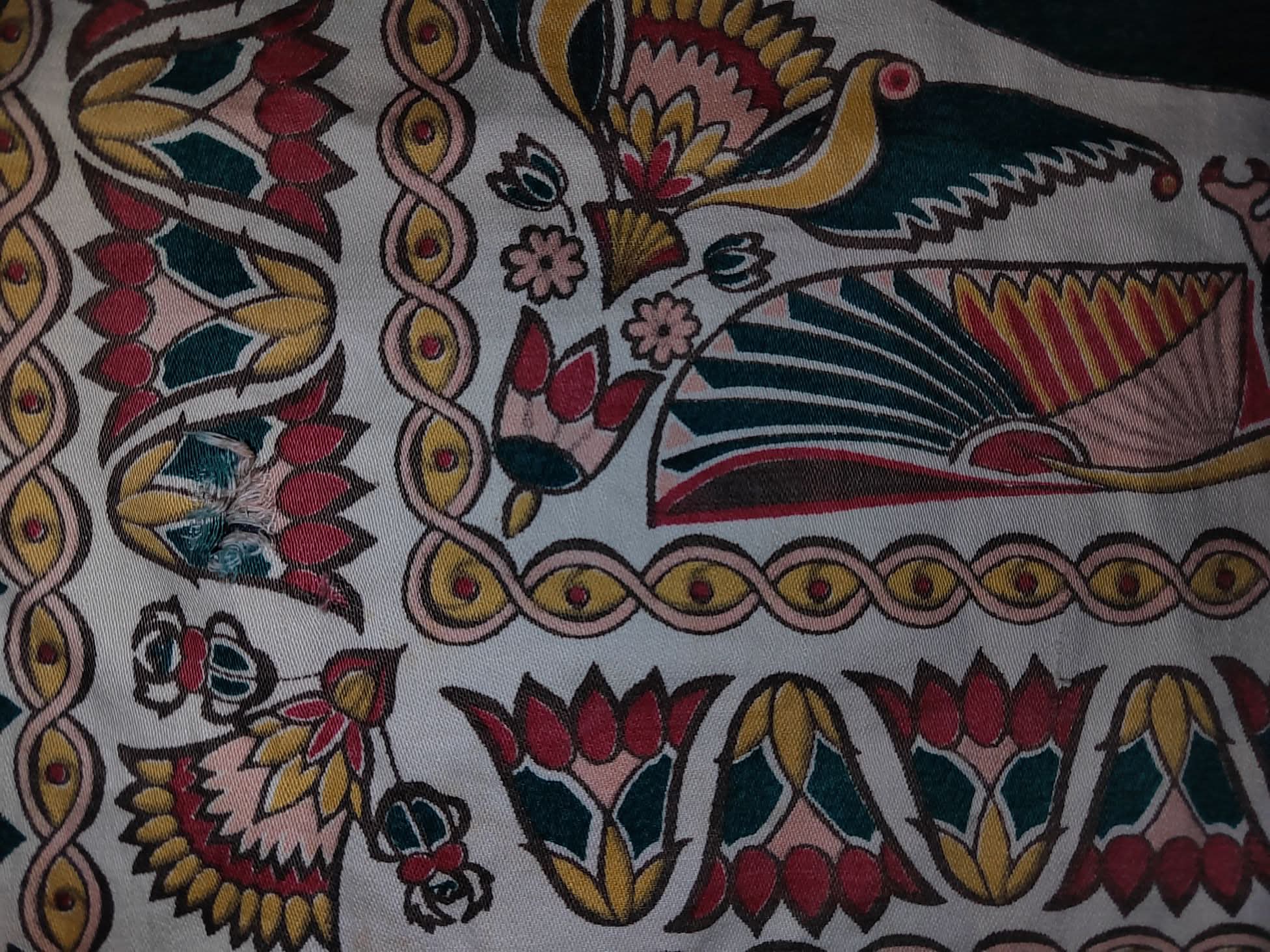 قماش حرير مطبوع عتيق – الملك فاروق ملك مصر يفترض أنها طُبعت في مصبغة بدر بالإسكندرية في مصر بين عامي 1950/1951 قبل أعمال الشغب في القاهرة مباشرة. كما تنص على أنها واحدة من 12 قطعة فقط طُبعت وبعدها دُمرت بكرة الطباعة. كان الشخص يعمل لدى شركة باورز ساماس أكس ماشين كمهندس خدمة عندما حصل على القطعة من مدير الطباعة آنذاك. لست متأكدًا تمامًا من نوع القماش ولكنه يحتوي على لمعان، لذا أفترض أنه حرير. يبلغ عرض القماش حوالي 72 سم × 45 سم وهو في حالة جيدة مع وجود قطع بسيط جدا. كما هو موضح في الصورة ، لم يتم الانتهاء من الحواف،